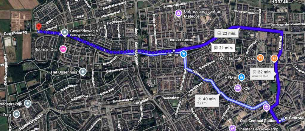 Vanaf het central station is de optie van een sneltrein en een stoptrein, je kunt bij de jumbo uitstappen en vanaf daar wandelen, het wandelen duurt ongeveer 22 minuten dit zal je ongeveer 12 euro kosten, ook kun je vanaf het centraal station lopen maar dit zal je vanaf het centraal station 40 minuten maar vanaf oss west zal het 30 minuten duren.